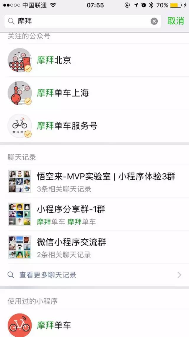 另外一個入口是微信聊天窗口頂部的搜索,會顯示該名稱下的公眾號以及小程序。